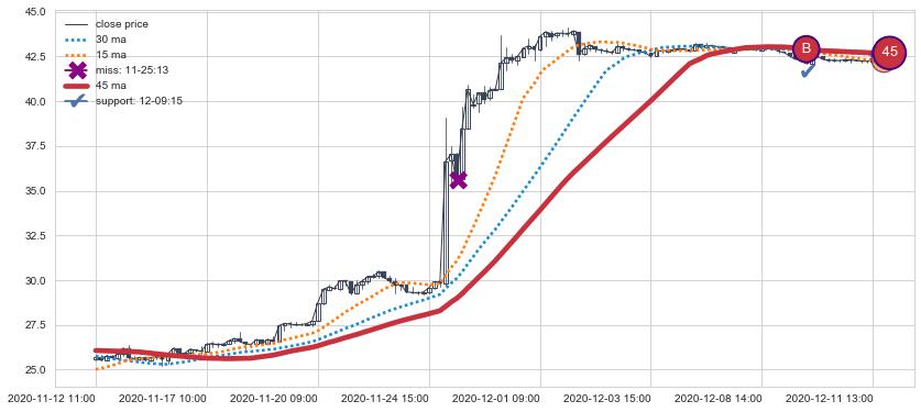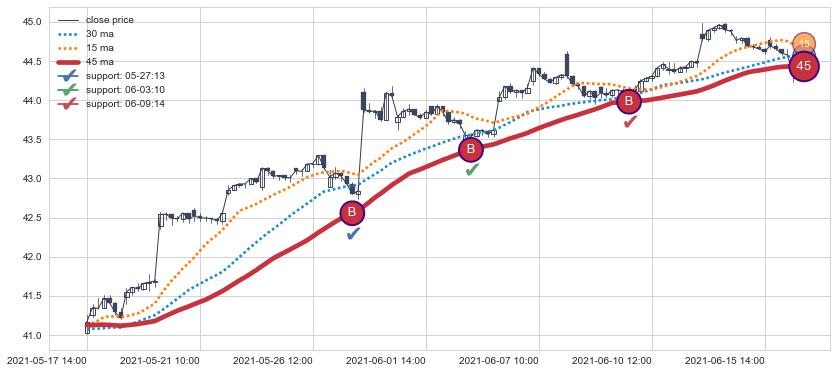 上涨趋势05-17 14:00-06-16 13:00,均线45确认关键支撑3处