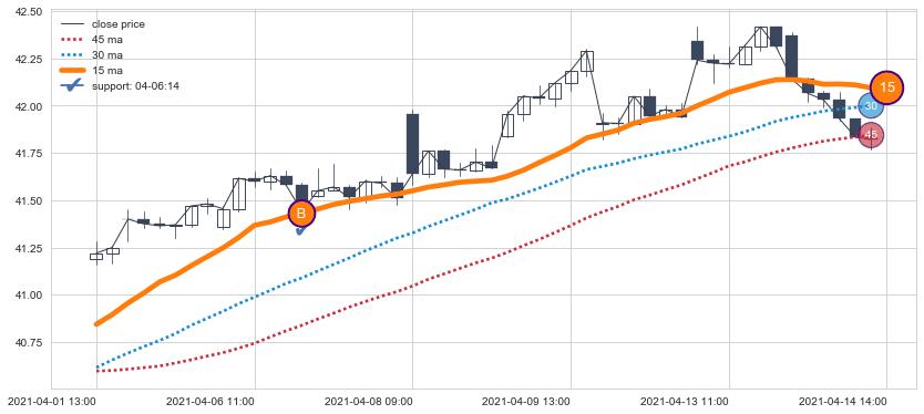 上涨趋势04-01 13:00-04-14 14:00,均线15确认关键支撑1处