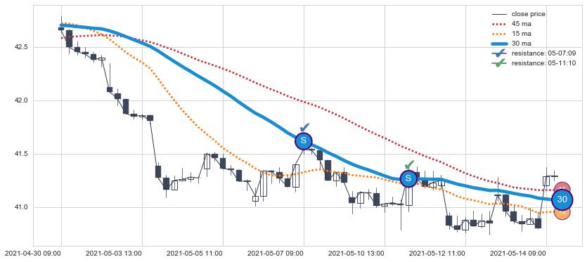 下跌趋势04-30 09:00-05-14 10:00,均线30确认关键阻力2处