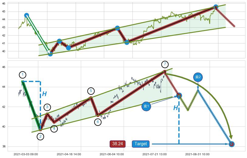 ➢ 降楔型:支撑位【③⑤⑦】不断走低,且对比上边下跌速度慢,构成【楔型】慢线