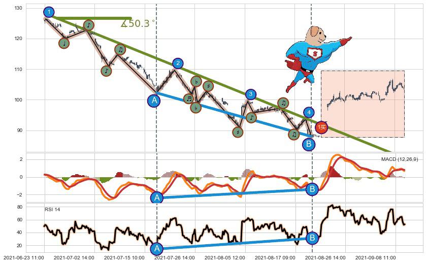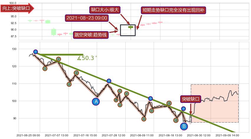➢ 最后的下跌趋势2021-06-23 12:00至2021-08-23 15:00:存在突破迹象,后续小反弹或者反转上涨