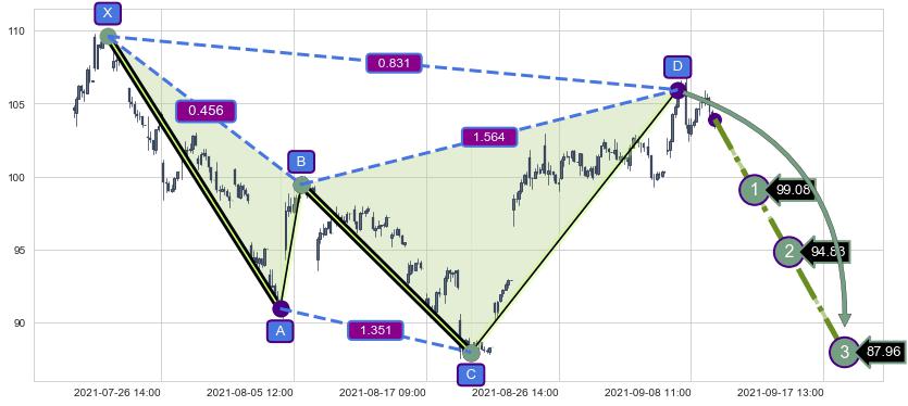 ➢ 距离预测D点位置有足够的下跌空间, 与看涨【蝙蝠】形态相反,实际方向【看跌】
