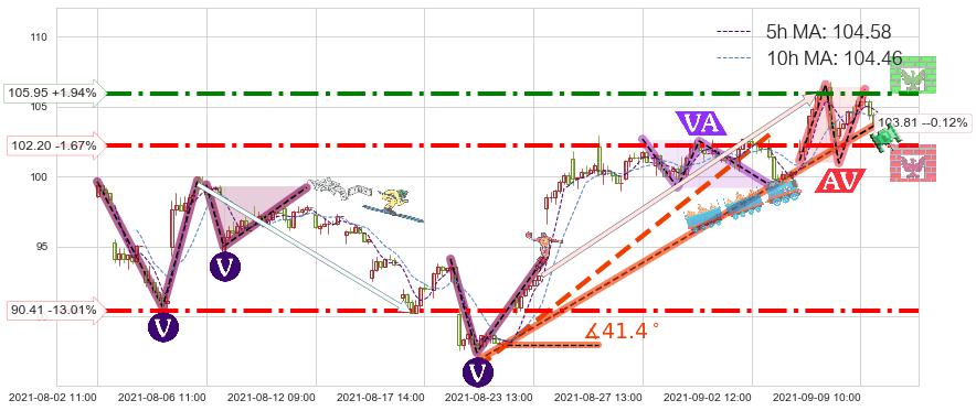 ♘ 阻力价格位105.95,可信任强度73.57%,距离最后交易2021-09-09 14:00形成的收盘价格103.93相差 +1.94%