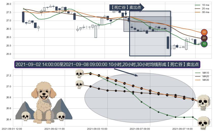 形态多维评估: ⚀ 2021-09-03 09:00:00-小时至2021-09-08 09:00:00-小时显现 10小时-20小时-30小时均线 【死亡谷】卖出点 看空信号,后市看跌,卖出