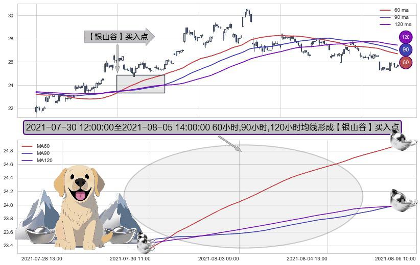 形态多维评估: ⚀ 2021-07-30 13:00:00-小时至2021-08-05 14:00:00-小时显现 60小时-90小时-120小时均线 【银山谷】买入点 看多信号,后市看涨,买入