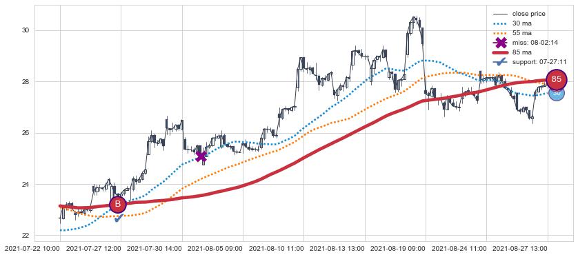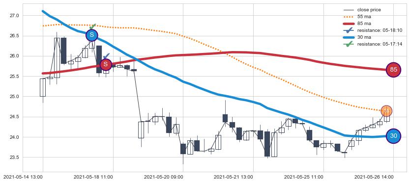 下跌趋势05-14 13:00-05-26 14:00,均线85, 30确认关键阻力2处