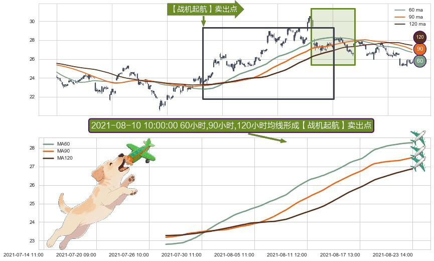 形态多维评估: ⚀ 2021-07-27 12:00:00小时-2021-08-23 14:00:00小时显现 60小时-90小时-120小时均线 【战机起航】卖出点 看空信号,后市看跌,卖出