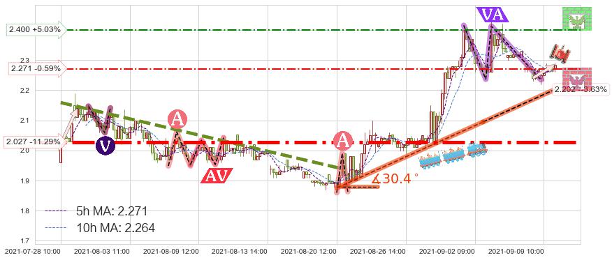 ♘ 阻力价格位2.400,可信任强度55.00%,距离最后交易2021-09-09 14:00形成的收盘价格2.285相差 +5.03%