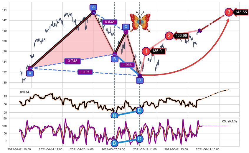 ➣ 已完成【蝴蝶】形态起点X: 03-31:15, 终点D: 05-12:14, 共176交易小时