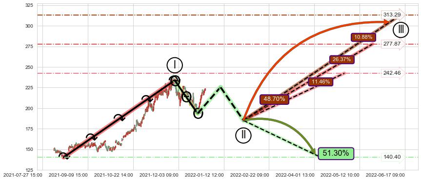 ➣ 高概率大级别循环上涨浪被破坏,反转向下(突破5浪起点)概率51.30%