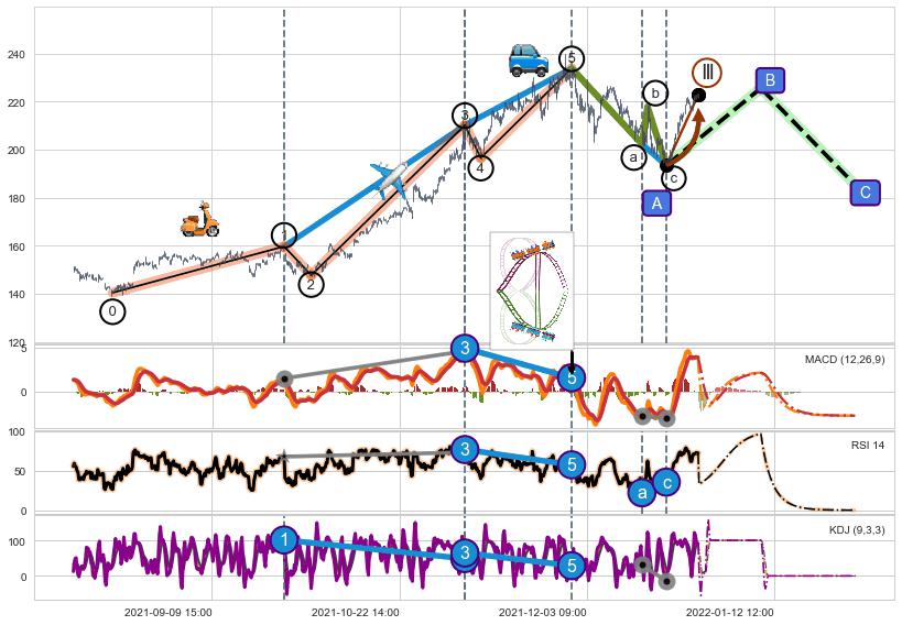 ➣ 1,3,5驱动浪MACD, RSI, KDJ走势都出现【常规背离】反转信号增强