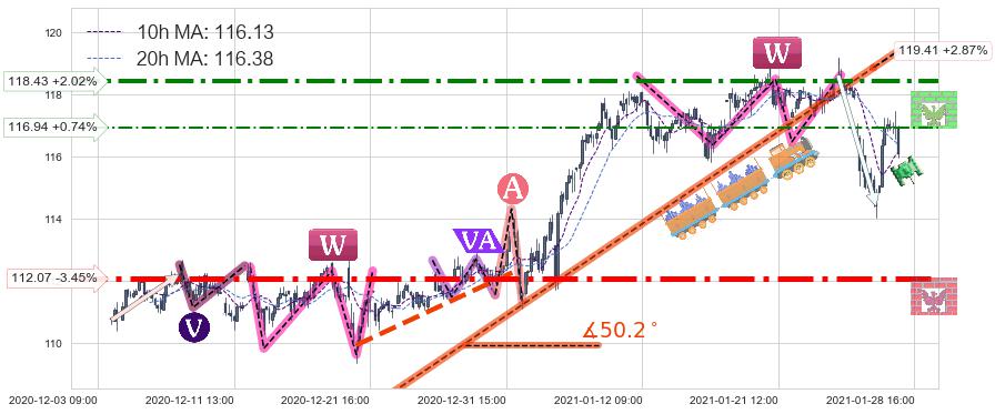 ➢ 【仅预测突破】最后价格:116.08与预测突破价格:113.90→【空间中等】后续最小【反转】第一目标价格→(02-04:10: 110.04 )