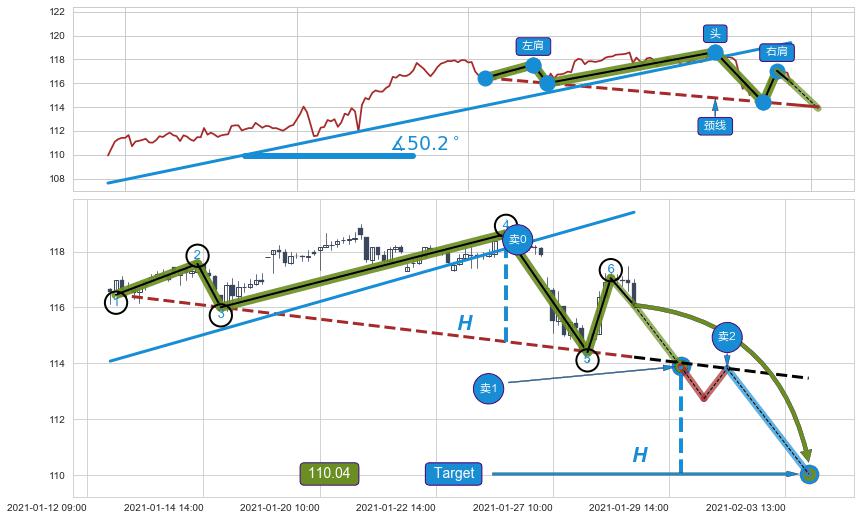 ➣ 最小反转跌幅→𝐇: 3.853 (头部与颈线垂直距离)