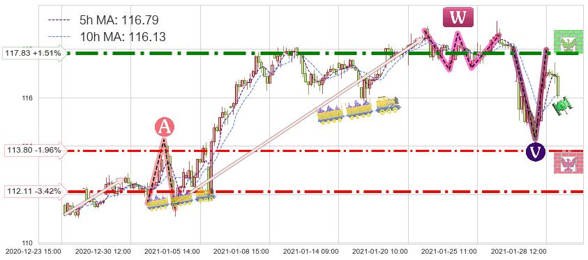 ♘ 支撑价格位113.80,可信任强度69.78%,距离最后交易2021-01-28 16:00形成的收盘价格116.08相差 -1.96%