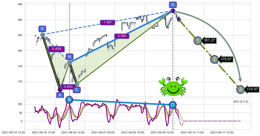 ➣ D点拟合预测价格181.31,距离最后交易收盘价格184.00相差 -1.46%