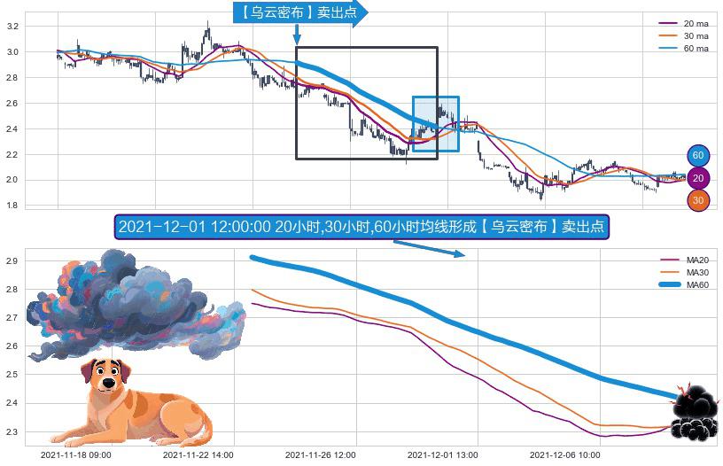⚀ 2021-11-23 10:00:00小时-2021-12-08 09:00:00小时显现 20小时-30小时-60小时均线 【乌云密布】卖出点 看空信号,后市看跌,卖出
