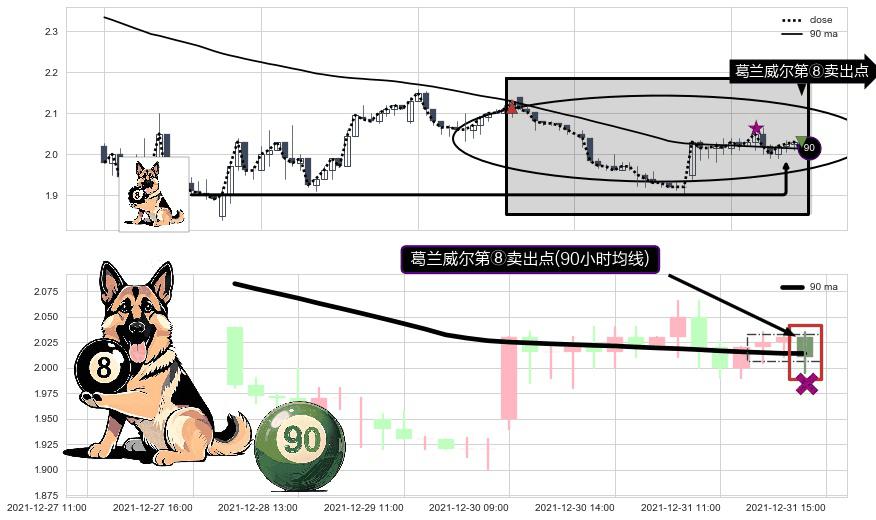 ⚀ 2021-12-31 15:00:00-小时显现 葛兰威尔均线 90小时均线 第⑧卖出点 下降趋势的中继信号,后市看跌,卖出信号