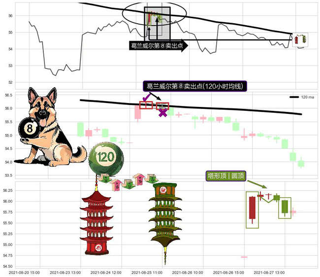 ➣ 2021-08-27 12:00:00-小时显现 葛兰威尔均线 120小时均线 第⑧卖出点 下降趋势的中继信号,后市看跌,卖出信号