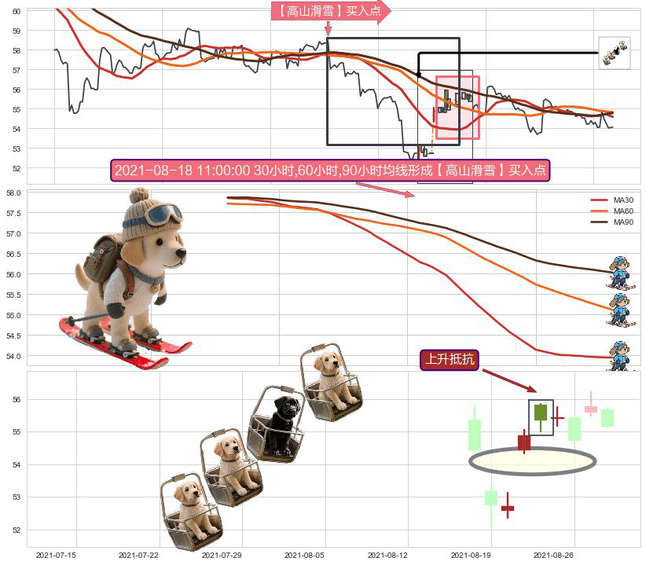 ➣ 2021-08-11 15:00:00小时-2021-08-24 14:00:00小时显现 30小时-60小时-90小时均线 【高山滑雪】买入点 看多信号,后市看涨,买入