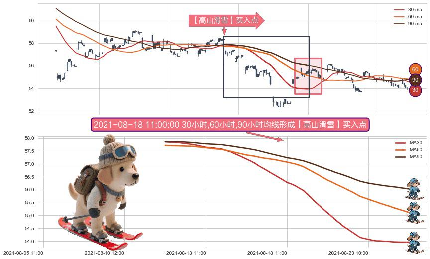 形态多维评估: ⚀ 2021-08-11 15:00:00小时-2021-08-24 14:00:00小时显现 30小时-60小时-90小时均线 【高山滑雪】买入点 看多信号,后市看涨,买入