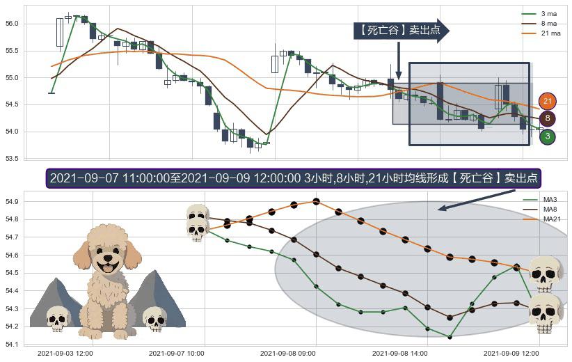 形态多维评估: ⚀ 2021-09-07 12:00:00-小时至2021-09-09 12:00:00-小时显现 3小时-8小时-21小时均线 【死亡谷】卖出点 看空信号,后市看跌,卖出