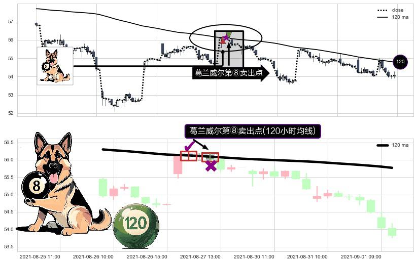 形态多维评估: ⚀ 2021-08-27 12:00:00-小时显现 葛兰威尔均线 120小时均线 第⑧卖出点 下降趋势的中继信号,后市看跌,卖出信号
