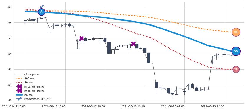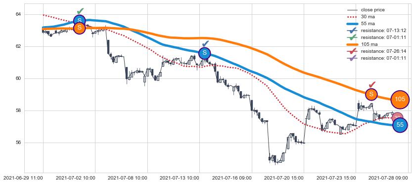 下跌趋势06-29 11:00-07-28 09:00,均线105, 55确认关键阻力3处