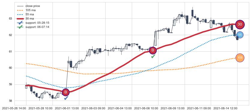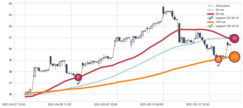 上涨趋势04-27 12:00-05-14 10:00,均线105, 30确认关键支撑2处