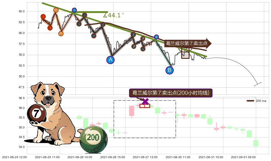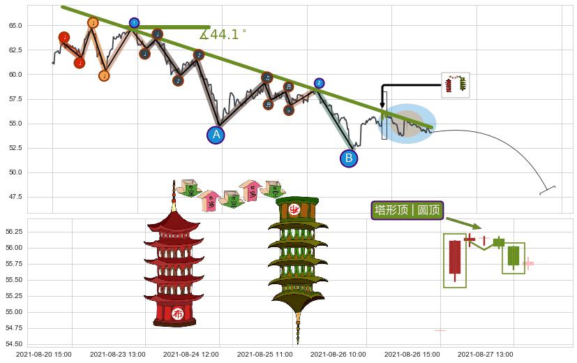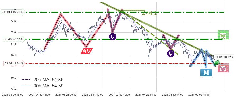 🦴 长线均值回复组合短线趋势跟踪[强阻力信号]2021-06-09 11:00-2021-08-27 10:00下跌趋势依然成立(下跌趋势跟踪依然存在),短线价格略微上行反弹(均值回复猜想),即将接近下跌趋势提供的未破位阻力价格:54.57。