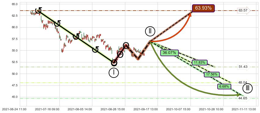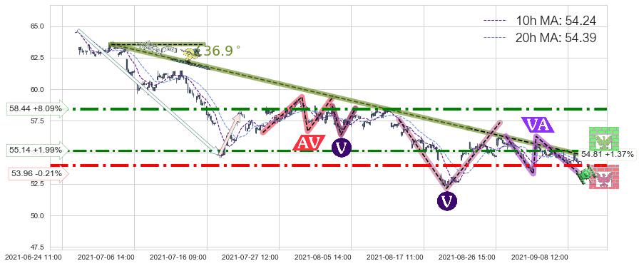 🦴 长线均值回复组合短线趋势跟踪[强阻力信号]2021-07-01 11:00-2021-08-23 14:00下跌趋势依然成立(下跌趋势跟踪依然存在),短线价格略微上行反弹(均值回复猜想),即将接近下跌趋势提供的未破位阻力价格:54.81。