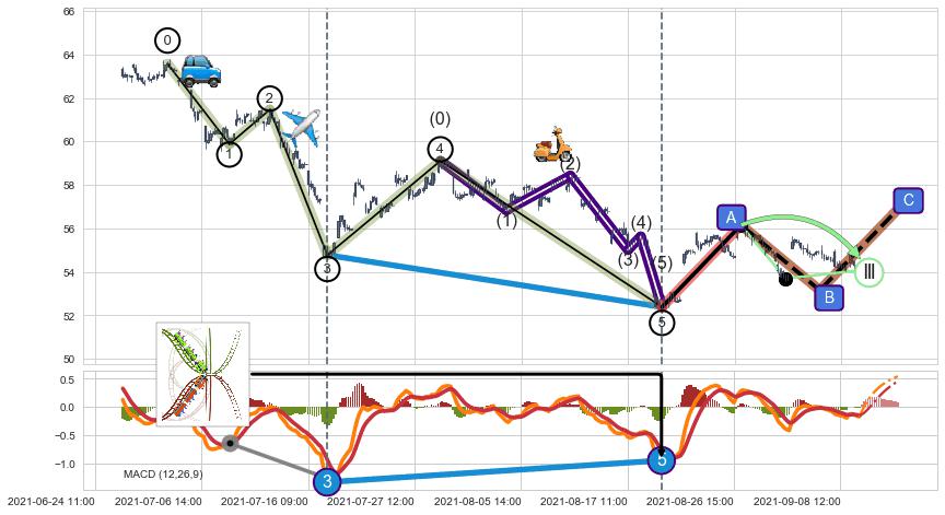 从2021-07-23 11:00至2021-08-03 14:00,共包含52个小时,阶段股价上涨2.57%,阶段股价变动位移路程比: 1 : 7