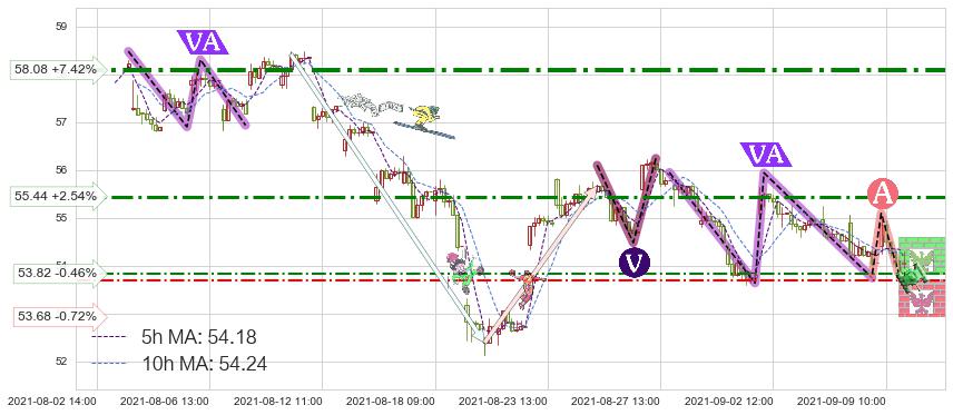 ♘ 阻力价格位55.44,可信任强度56.76%,距离最后交易2021-09-09 14:00形成的收盘价格54.07相差 +2.54%
