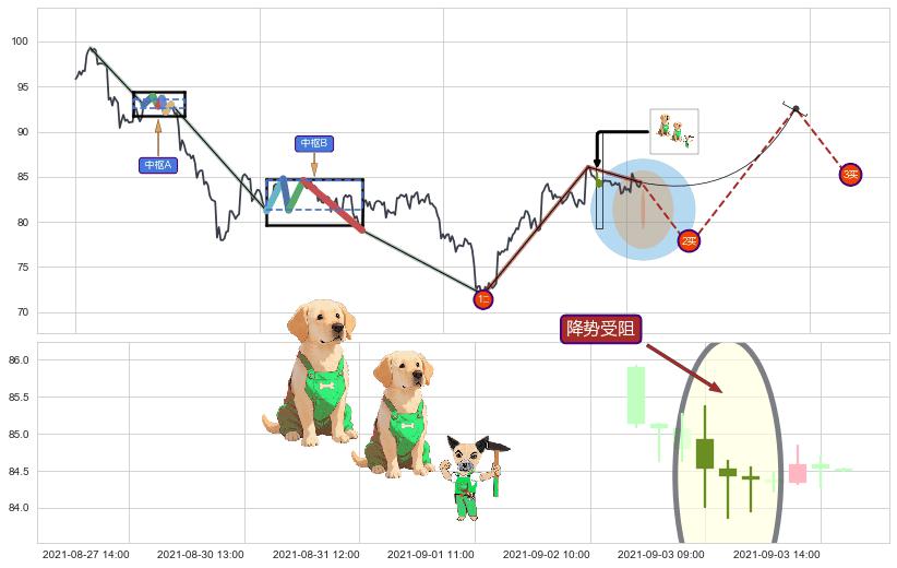 ➣ 【中枢B】:07-23:11-08-04:14,中枢由5笔构成,共53交易小时, ZG=84.59, ZD=81.30