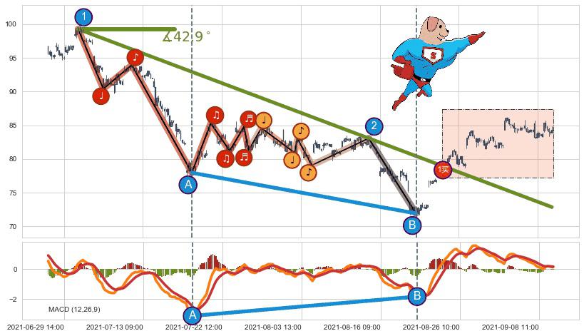 ⚔️ 2021-07-01 11:00-2021-08-25 11:00下跌趋势存在反转上涨[机会],其原下跌趋势的阻力位(72.86)已被突破[强支撑信号],原下跌趋势角度: 42.9˚