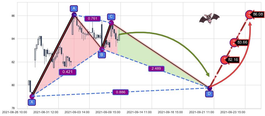 ➢ 距离预测D点位置有足够的下跌空间, 与看涨【蝙蝠】形态相反,实际方向【看跌】