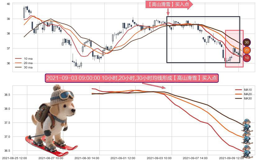 形态多维评估: ⚀ 2021-08-30 12:00:00小时-2021-09-09 12:00:00小时显现 10小时-20小时-30小时均线 【高山滑雪】买入点 看多信号,后市看涨,买入
