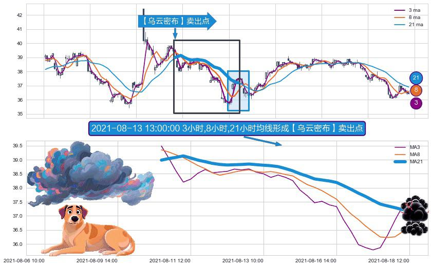 形态多维评估: ⚀ 2021-08-10 14:00:00小时-2021-08-18 12:00:00小时显现 3小时-8小时-21小时均线 【乌云密布】卖出点 看空信号,后市看跌,卖出