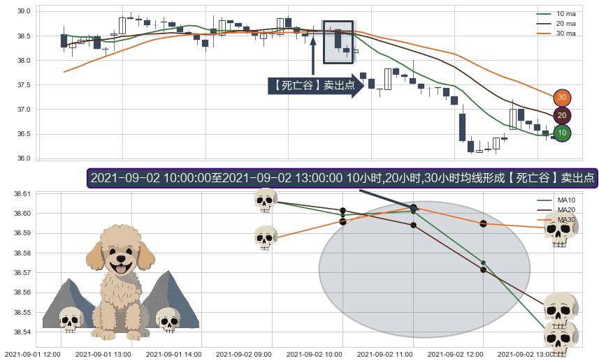 形态多维评估: ⚀ 2021-09-02 11:00:00-小时至2021-09-02 13:00:00-小时显现 10小时-20小时-30小时均线 【死亡谷】卖出点 看空信号,后市看跌,卖出