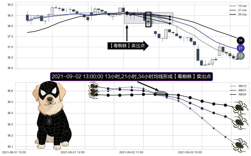 形态多维评估: ⚀ 2021-09-02 13:00:00小时显现 13小时-21小时-34小时均线 【毒蜘蛛】卖出点 看空信号,后市看跌,卖出