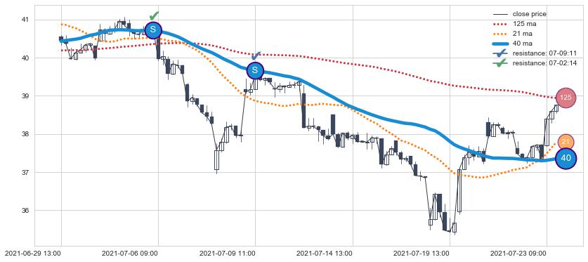 下跌趋势06-29 13:00-07-23 11:00,均线40确认关键阻力2处