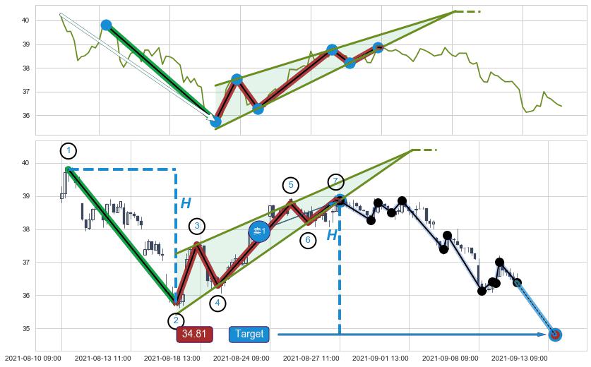 ➢ 最小中继整理跌幅→𝐇: 4.05 (𝐇楔型旗杆的长度:楔型起点→顶点)