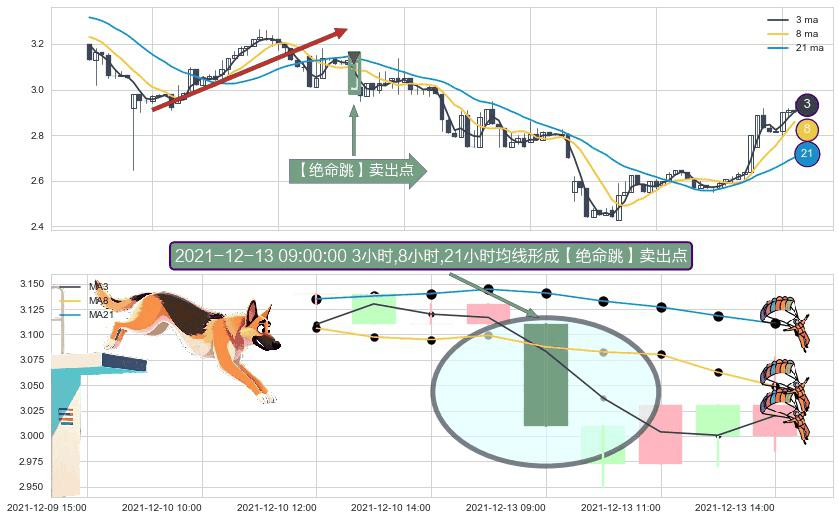 形态多维评估: ⚀ 2021-12-13 09:00:00小时显现 3小时-8小时-21小时均线 【绝命跳】卖出点 看空信号,后市看跌,卖出