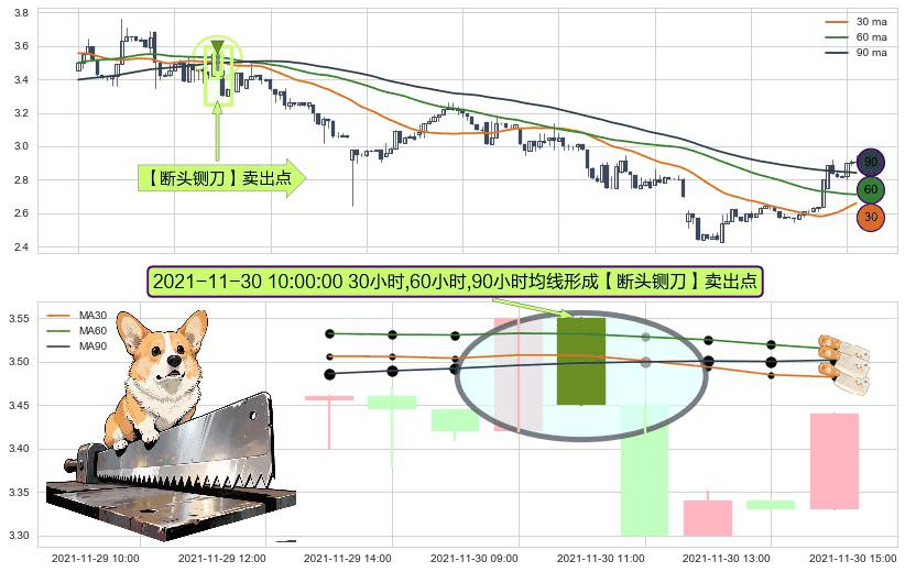形态多维评估: ⚀ 2021-11-30 10:00:00小时显现 30小时-60小时-90小时均线 【断头铡刀】卖出点 看空信号,后市看跌,卖出
