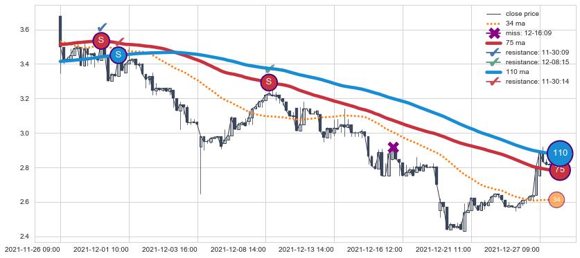 下跌趋势11-26 09:00-12-27 12:00,均线75, 110确认关键阻力3处