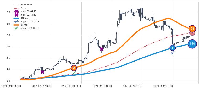 上涨趋势02-02 10:00-02-24 13:00,均线34, 110确认关键支撑2处