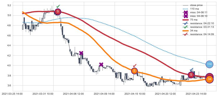 下跌趋势03-25 14:00-04-23 14:00,均线34, 75确认关键阻力3处