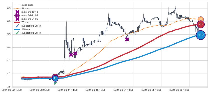 上涨趋势06-02 13:00-07-01 12:00,均线75, 110确认关键支撑1处