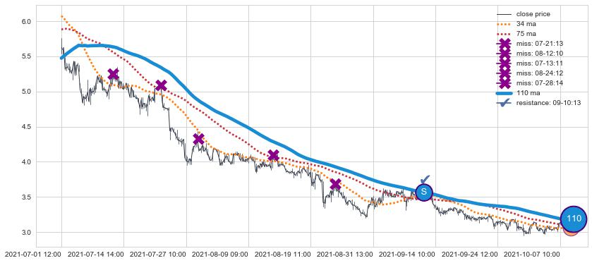 下跌趋势07-01 12:00-10-07 12:00,均线110确认关键阻力1处