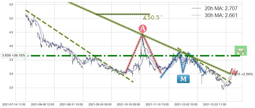 🦴 长线均值回复组合短线趋势跟踪[强阻力信号]2021-07-14 11:00-2021-12-27 13:00下跌趋势依然成立(下跌趋势跟踪依然存在),短线价格略微上行反弹(均值回复猜想),即将接近下跌趋势提供的未破位阻力价格:2.975。