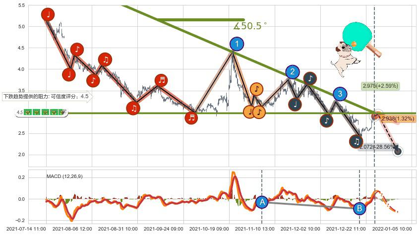 ♘ 在最后的下跌阶段2021-07-14 11:00至2021-12-27 13:00,存在 持续未破位的阻力位 ,阻力价格2.975,可信任强度88.72%,其距离最后价格2.900相差 +2.59%